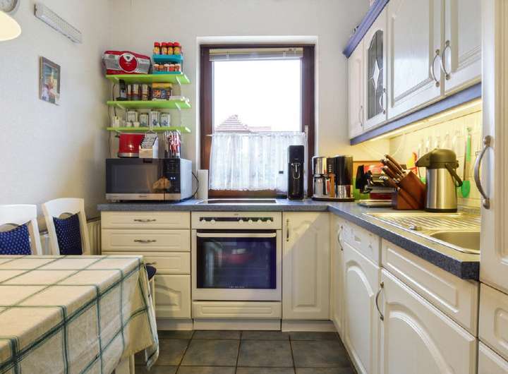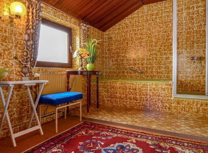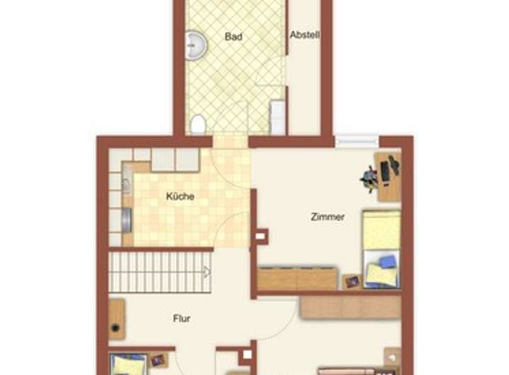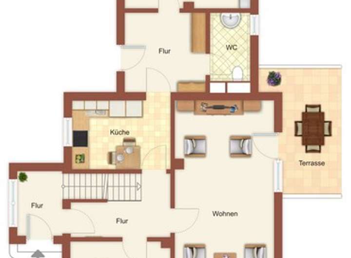 Das Erdgeschoss verfügt über eine Wohnfläche von ca. 67 m² und teilt sich auf in Eingangsbereich/Flur, Wohnzimmer mit Durchgang zur schönen Terrasse, Esszimmer, Küche mit schöner im Landhausstil gehaltener Einbauküche nebst einem Esstisch für 2 Personen, Gästetoilette, Waschküche sowie Abstellraum. Im Obergeschoss, mit einer Gesamtwohnfläche von ca. 55 m², befinden sich zweieinhalb Zimmer, ein älteres Vollbad mit Badewanne, Dusche und Fenster.