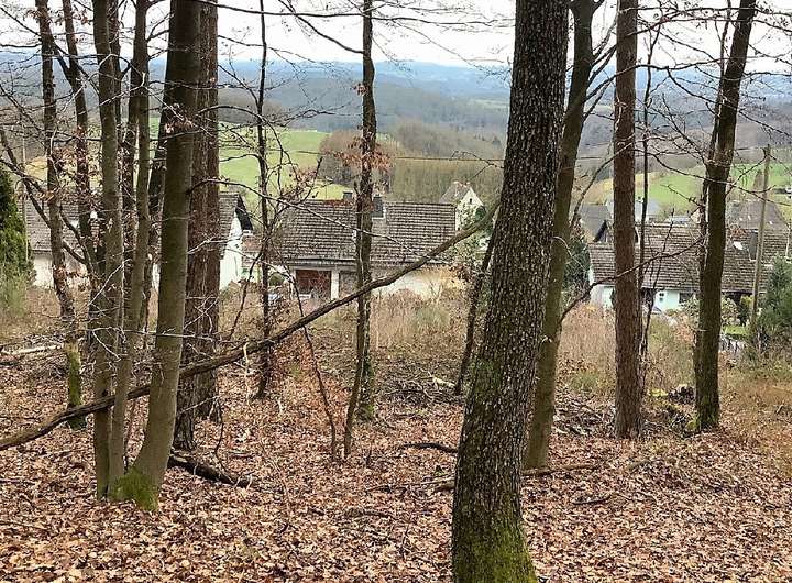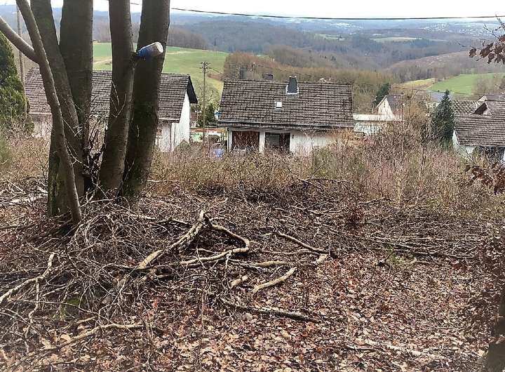 Momentan befindet sich reichlich Begrünung auf dem Baugrundstück, welche vor Bebauung vom neuen Eigentümer eigenverantwortlich entfernt werden müsste. Vorteilhafter Weise kann dies zu einem großzügigen Vorrat an Feuerholz für Ihren neuen Kamin führen.