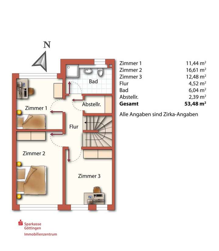 Das Obergeschoss besteht aus drei Zimmern, einem Tageslichtbad mit Dusche (optional mit zusätzlicher Badewanne) und einem Abstellraum.