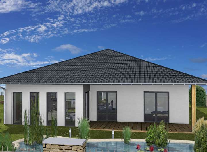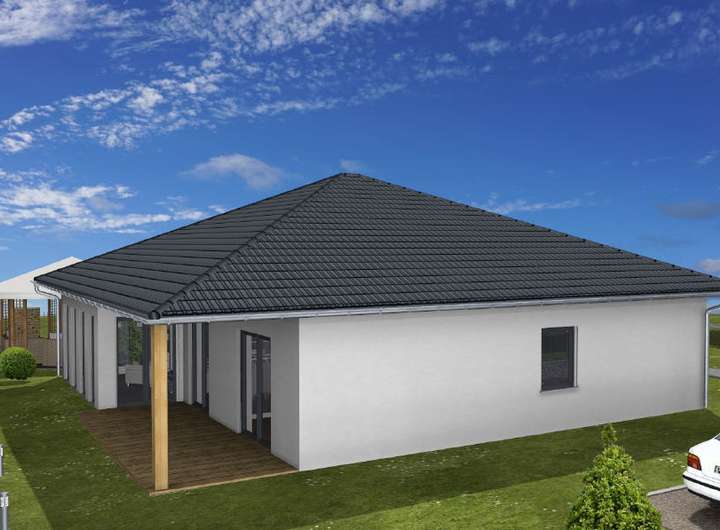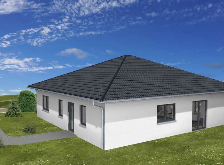Es handelt sich um einen Walmdachbungalow der Firma Isowoodhaus welcher Bezugsfertig erstellt wird.