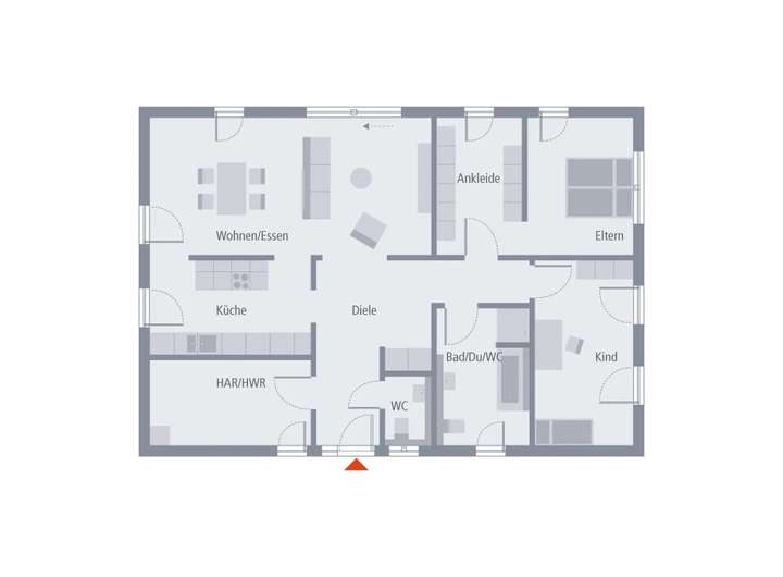 Our Bungalow 1 hipped roof offers everything a small family needs to live and feel good on a living space of 107 m2. The combined living-dining room is spacious and bright thanks to three glass doors to the garden. The kitchen, which can be accessed without a door from the dining room, also offers enough space and daylight. The adjoining, 10 m2 large utility room can also be entered directly from the outside and thus has a double practical benefit: in this way, shopping can be stocked up directly and the living rooms are spared from possible dirty shoes. The equally spacious hallway connects the living area of the house with the private retreats: the parents' area with bedroom and adjoining dressing room and a light-flooded children's room. A fully equipped bathroom with bath and shower and a guest toilet complete the offer.