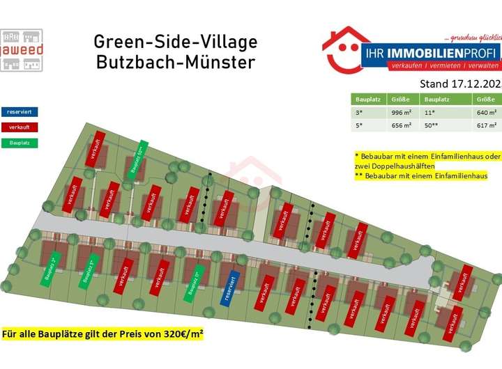 Das Baugebiet ist ein reines Wohngebiet mit einer Sackgasse. Der Preis pro m² beträgt 320 EUR.