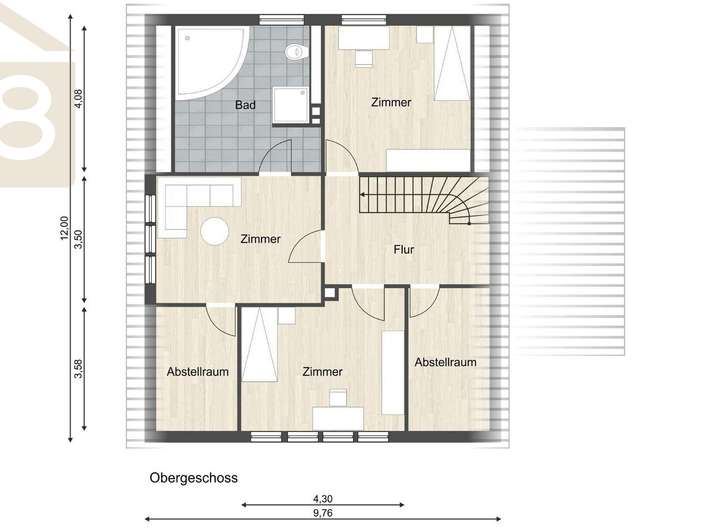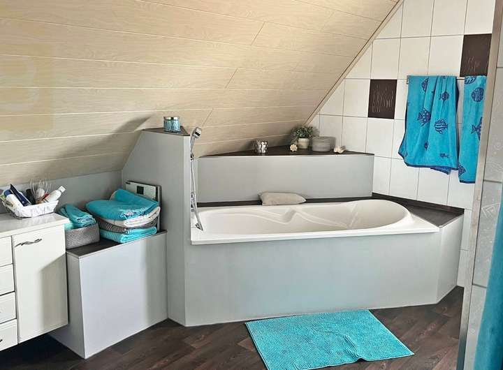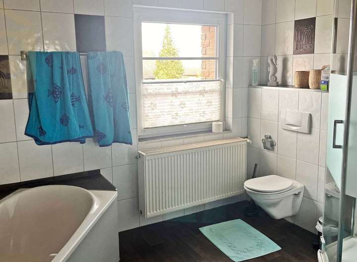 Im Obergeschoss erwarten Sie zwei Kinderzimmer, ein Schlafzimmer, ein großzügiges Badezimmer mit Eckbadewanne und Dusche sowie ein weiteres kleines Kinderzimmer/Büro.