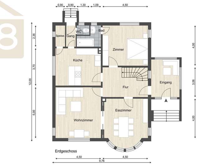 Im Erdgeschoss gelangen Sie über einen angebauten Windfang, der ausreichend Platz für die Garderobe bietet, in den Flur. Von hier aus erreichen Sie das Schlafzimmer mit angrenzendem WC, das Esszimmer, das Wohnzimmer mit Kamin und die moderne Küche, die bereits im Kaufpreis enthalten ist und über einen eigenen kleinen Vorratsraum verfügt.