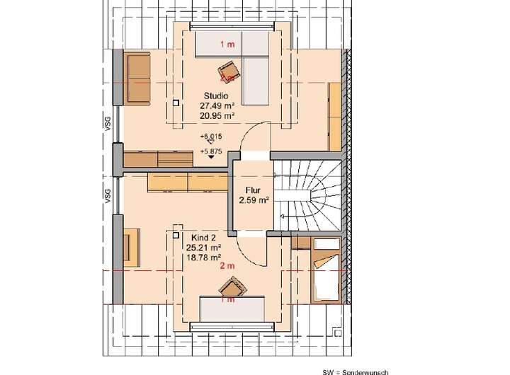 Im Dachgeschoss befinden sich zwei weitere Räume wie z.B. ein Kinderzimmer und ein Studio. Die zweite Variante beinhaltet ein großes Elternschlafzimmer mit Ankleide und ein Studio. Ein zusätzliches Duschbad im Dachgeschoss ist auf Wunsch erhältlich.