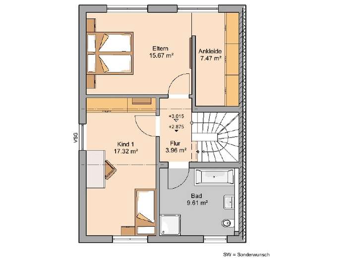 Das Obergeschoss beherbergt entweder ein großes Elternschlafzimmer mit Ankleide und ein Kinderzimmer (Variante links) oder drei Kinderzimmer (Variante rechts). Das Highlight ist ein großes Badezimmer für die ganze Familie.