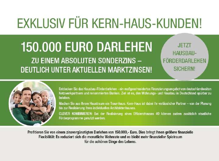 Kern-Haus baut individuelle und massive Architektenhäuser zu einem attraktiven Preis-Leistungs-Verhältnis – und das bereits mit einer Erfahrung seit 1980. Bei Kern-Haus erhalten Sie unter anderem 10 Jahre Gewährleistung auf die wesentlichen Bauleistungen, bis zu 24 Monate Preissicherheit sowie eine dokumentierte 5-Phasen-TÜV-Prüfung während der Bauphase. Jedes Kern-Haus als Effizienzhaus 40 ist bereits QNG-zertifiziert durch die Deutsche Gesellschaft für nachhaltiges Bauen (DGNB).