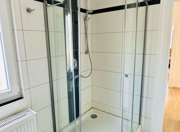 Die Wohnung im Erdgeschoss hat einen eigenen Hauseingang direkt angrenzend an die Außenstellpätze des Objektes. Die rund 66 m² Wohnfläche dieser sehr großzügigen 2-Zimmer Wohnung wirken durch die breiten Flure noch größer. Neben einem sanierten Tageslichtbadezimmer mit Dusche und Badewanne sowie einer schicken Küche verfügt diese Wohneinheit noch über ein helles Wohnzimmer sowie ein zur Seite ausgerichtetes großes Schlafzimmer. Der Hauseingangsbereich ist durch eine Abschlusstüre zum Wohnraum nochmal getrennt. Rückseitig ist ein großer überdachter Balkon vorhanden.