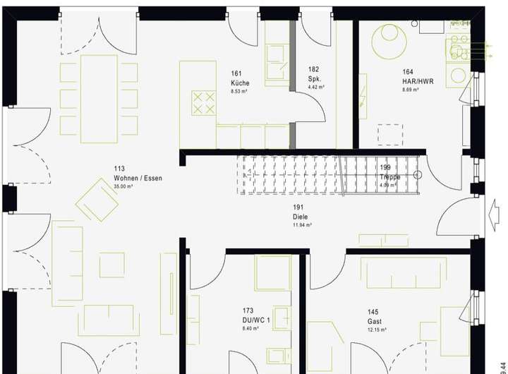 Unsere projektierten Ausbauhäuser sind von außen fertig verputzt, mit Fenstern, Eingangstür, Dacheindeckung und Dachrinnen. Die Heizungsanlage mit Fußbodenheizung, mit kompletter Elektroinstallation, sowie der Buche-Holztreppe EG/DG sind inkl. Montage enthalten.