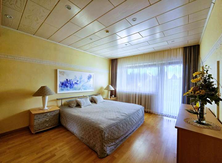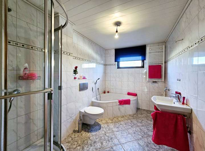 Im Obergeschoss erwartet Sie eine weitere großzügige Eingangsdiele, die den Wohnbereich mit Esszimmer und einem Süd-Balkon verbindet. Auch dieser Balkon ist vom Schlafzimmer zugänglich und bietet einen herrlichen Ausblick auf die Umgebung. Hier finden Sie zudem ein weiteres Kinderzimmer, eine Küche sowie ein weiteres Badezimmer mit ähnlichem Komfort wie im Erdgeschoss – auch hier erwarten Sie eine Eckbadewanne, eine Dusche und eine Fußbodenheizung.