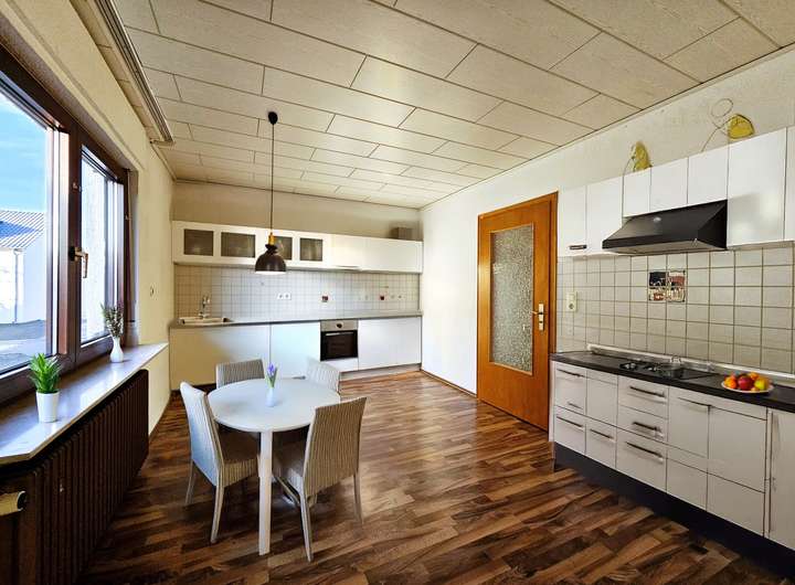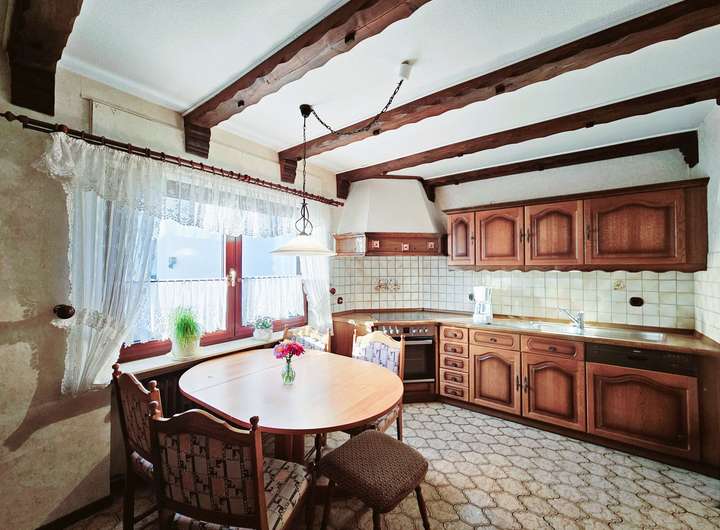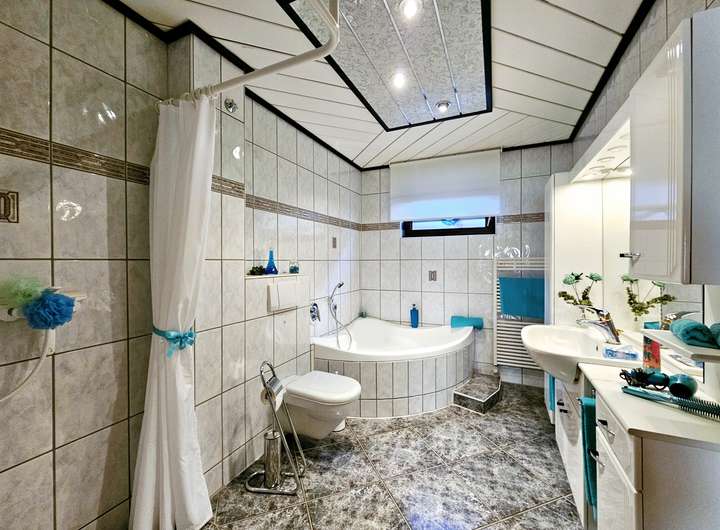 Die gut ausgestattete Küche und das Badezimmer sind ebenfalls im Erdgeschoss untergebracht. Das Badezimmer ist mit einer komfortablen Eckbadewanne sowie einer Dusche ausgestattet und bietet zudem eine Fußbodenheizung für zusätzliche