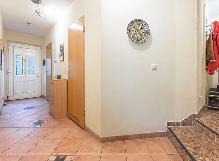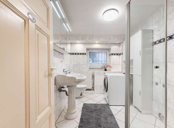 Die Wohneinheit im Erdgeschoss wurde umfassend modernisiert und präsentiert sich heute in einem zeitgemäß ausgestatteten, vollständig bezugsfertigen Zustand. Sie umfasst zwei Schlafzimmer, ein großzügiges Wohn- und Esszimmer mit direktem Zugang zur nach Süd-Ost ausgerichteten Terrasse und zum weitläufigen Garten, eine moderne Küche, zwei Bäder, einen Hobbyraum sowie Hauswirtschafts- und Heizungsbereiche. Zusätzlich ist das Erdgeschoss mit einer Fußbodenheizung ausgestattet, die für ein besonders angenehmes Wohnklima sorgt.