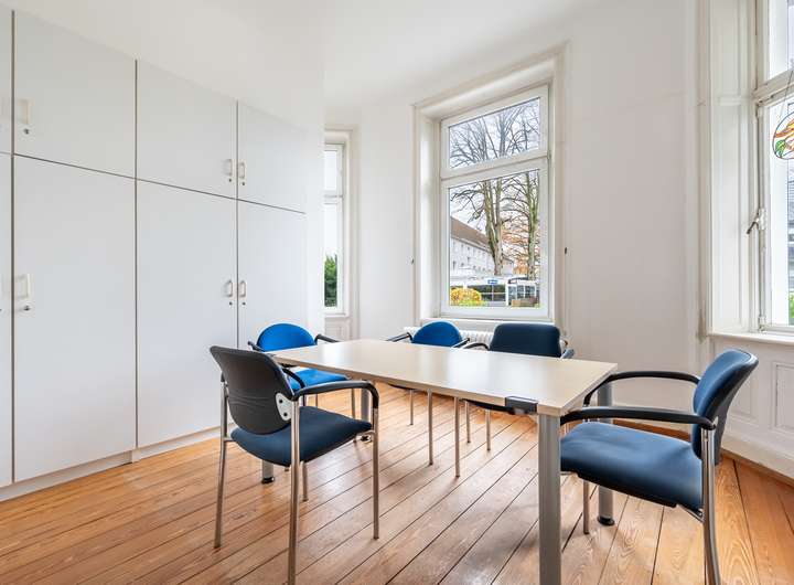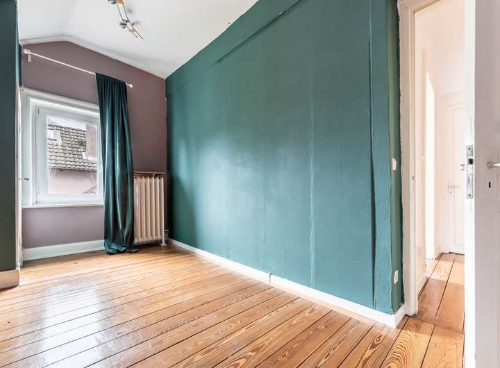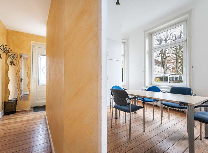 Das Hochparterre kombiniert einen gewerblichen Bereich mit einer weiteren Wohneinheit. Der Gewerbeteil – derzeit als Sprachschule genutzt – umfasst ein Büro, einen Schulungsraum und ein Gäste-WC. Der angrenzende Wohnbereich verfügt über eine moderne Küche, ein helles Erkerzimmer sowie Zugang zu einer großzügigen Terrasse mit Blick in den Garten. Trotz attraktiver historischer Elemente befindet sich dieser Bereich in renovierungsbedürftigem Zustand und bietet vielseitiges Potenzial.
