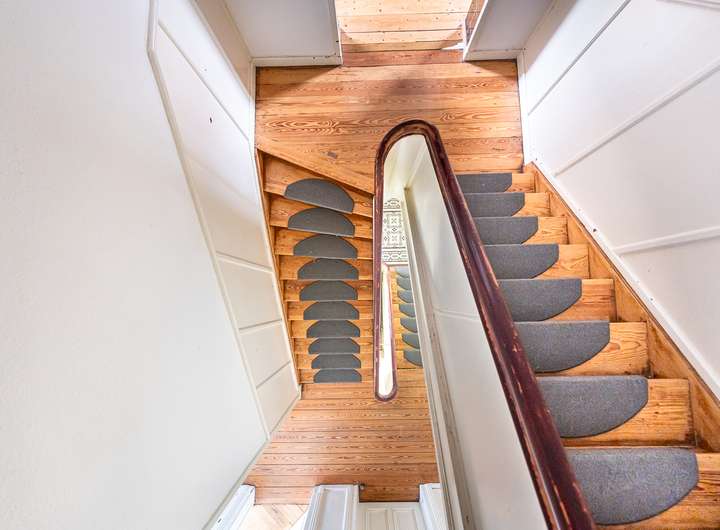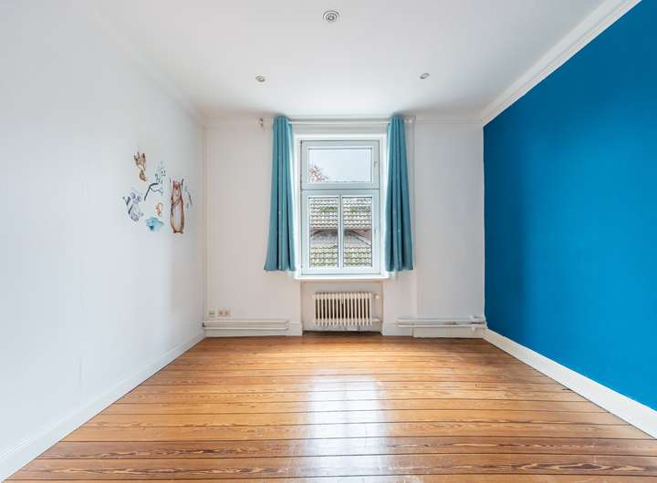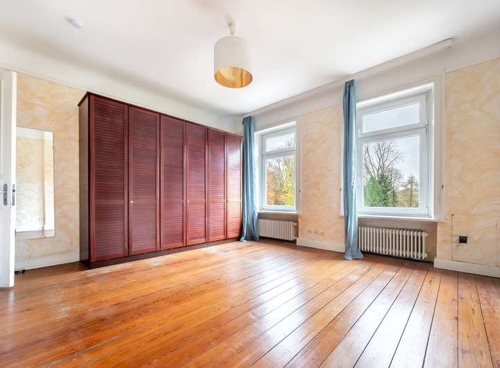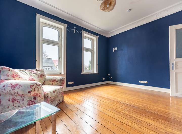 Im Obergeschoss der Hauptwohnung stehen vier gut geschnittene Zimmer sowie ein Badezimmer mit separatem WC zur Verfügung. Hohe Decken, originaler Pitchpine- und Terrazzoboden sowie Stuckverzierungen verleihen der Etage einen eindrucksvollen Jugendstil-Charme. Auch dieser Bereich ist renovierungsbedürftig, bietet jedoch eine hervorragende historische Basis für individuelle Gestaltungsmöglichkeiten.