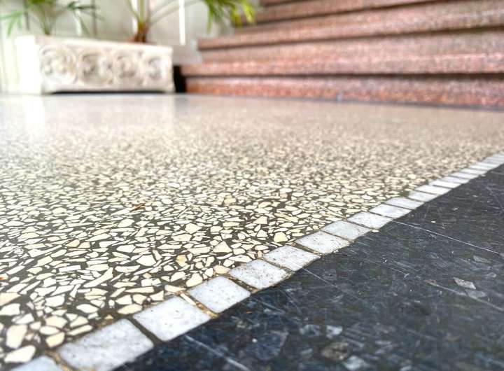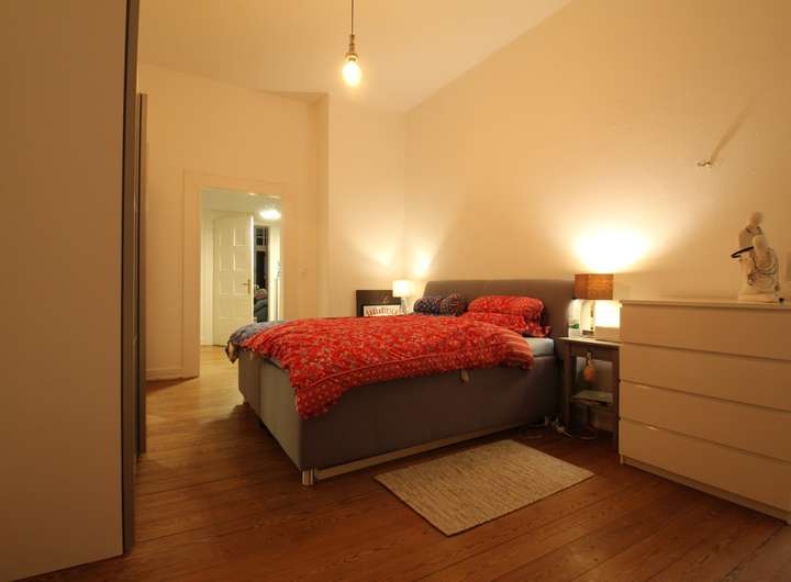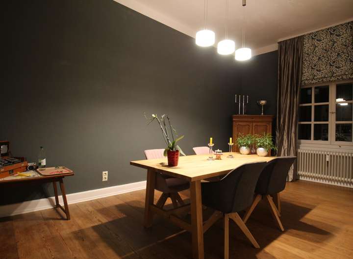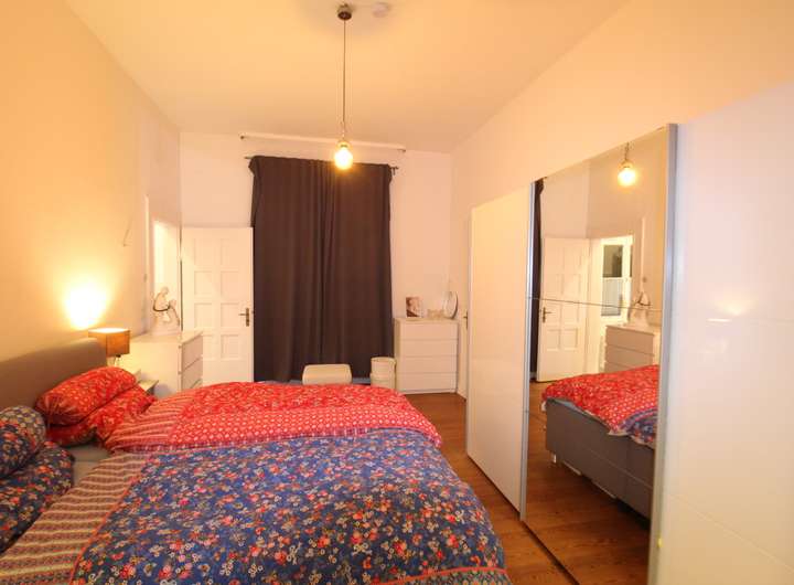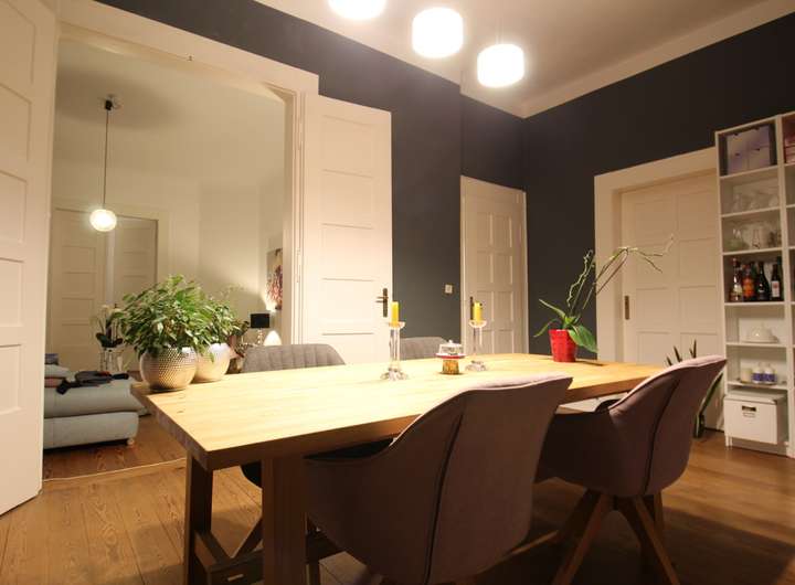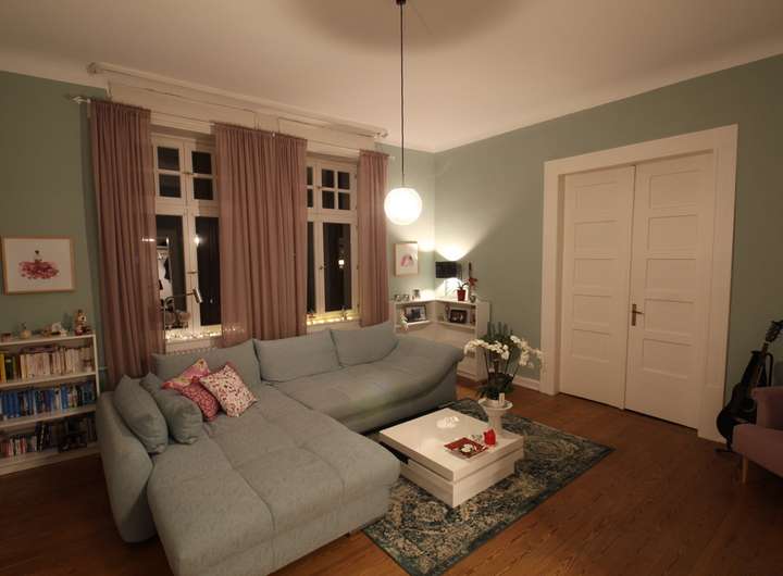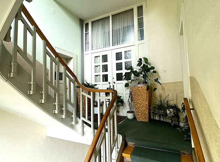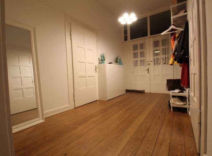 - hohe Decken, Flügeltüren, Terrazzo- und Dielenböden, Kassettentüren aus Holz