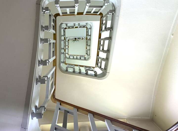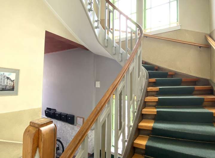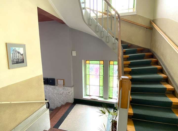 - Treppenhaus mit farbigen Glasfenstern und anspruchsvollem Holzgeländer