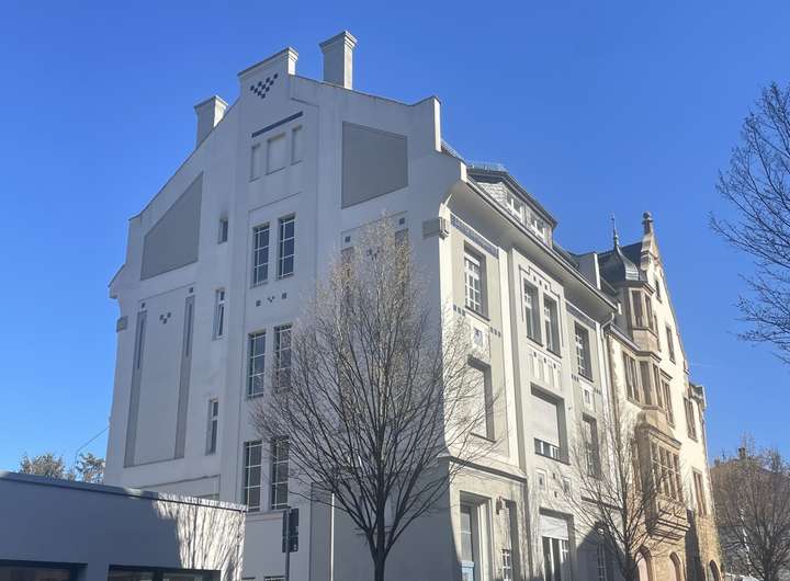 - zeittypischer Fassadendekor mit Friese, Kacheln und kassettierte Brüstungsfüllungen in Denkmalschutzzone