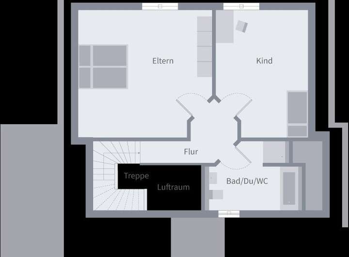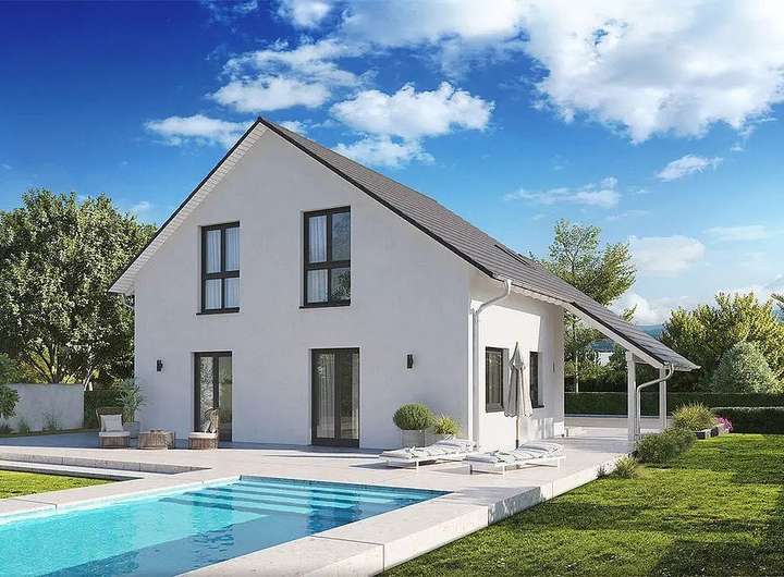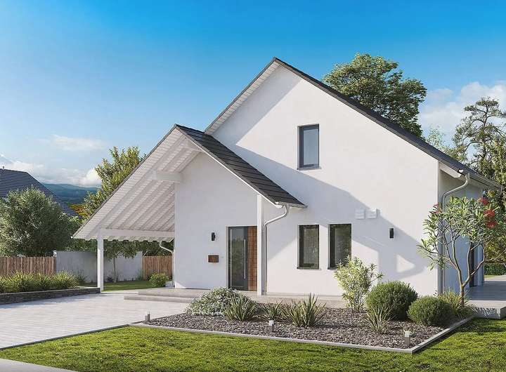 Bei kleinem Grundstück oder geringem Raumbedarf sind intelligente Lösungen gefragt, die durch eine raffinierte Aufteilung punkten. Das Designhaus 18.3 bietet eine Gesamtwohnfläche von rund 137 m² auf zwei Etagen, die bis in den kleinsten Winkel genau durchdacht wurden. Das elegante Einfamilienhaus verfügt über ein Satteldach mit Schleppdach, welches sich ideal als Carport bzw. Stellplatz für ein Fahrzeug eignet. Hohen Wohnkomfort verspricht vor allem der offen gehaltene Wohn-Ess-Bereich, der dank bodentiefer Fenster noch großzügiger wirkt und den Blick ins Grüne ermöglicht. Im Erdgeschoss befinden sich weiterhin die geschlossene Küche sowie Hauswirtschaftsraum und kleines Bad. Oben im Dachgeschoss sind Schlafzimmer, Kinderzimmer sowie Bad inklusive Badewanne, Dusche und WC direkt erreichbar und ermöglichen eine flexible Raumaufteilung.