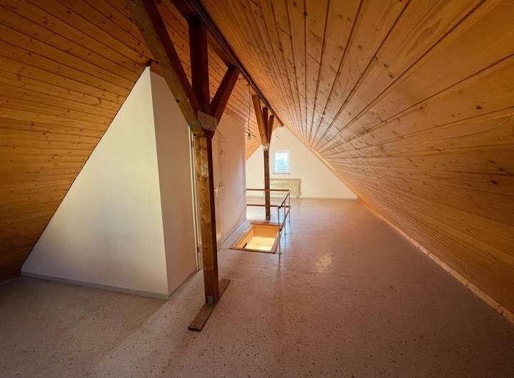 Über die Dachbodentreppe erreichen Sie das ausgebaute Dachatelier von über 25 m². Hier finden Sie ebenfalls den Heizungsraum mit Warmwasserspeicher und die Sieger Gas-Brennwert-Heizung vor.