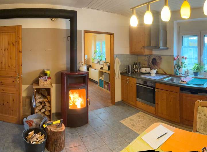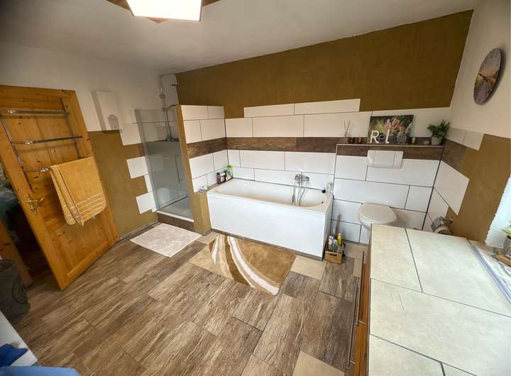 Das Haus ist mit Bruchsteinkeller in Massivbauweise errichtet worden. Die Fenster wurden im Wohnbereich um 2000 erneuert. Fenster im Speicher wurden diesen Sommer komplett erneuert. Wasserleitungen und die Elektroinstallation wurde erst vor kurzem erneuert. Der Dachboden ist vorbereitet zum Ausbau. Die wundervolle Vollholztreppe führt bis zum obersten Geschoss. Das Dach ist gedämmt und mit hochwertigem Naturschiefer gedeckt. Der kleine Anbau (ehemals Hühnerstall) wurde liebevoll als praktischer Mehrzweckraum modern umgebaut (mit Wasser und Abfluss). Als Hauptheizung dient der 8 KW Holzofen, der zentral im EG steht und es gibt noch ergänzend Nachtspreicheröfen in EG und OG. Gas liegt in der Straße. Das wundervolle große Grundstück in Südausrichtung bietet Platz für Hobby und Freizeit. Der große Hundezwinger kann auch wieder demontiert werden. Eine freistehende große Garage rundet das schöne Gebäudeensemble ab.