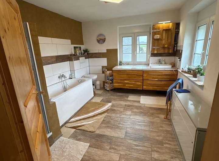 Im Obergeschoss bieten ein Kinderzimmer, das Elternzimmer und das große Bad mit Wanne und Dusche eine tolle Atmosphäre.
