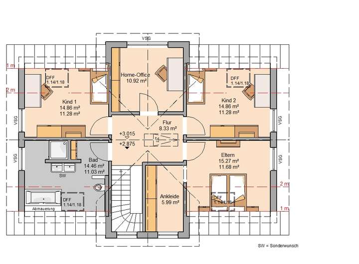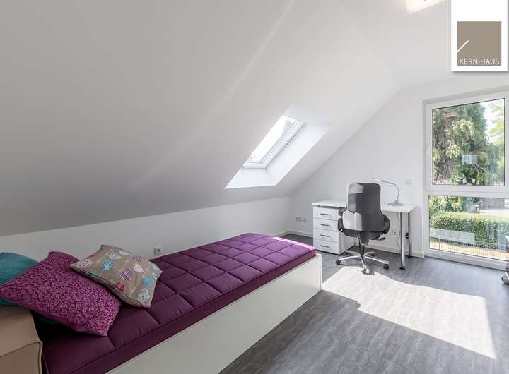 Das Dachgeschoss bietet zwei große Kinderzimmer, ein Home-Office und das Eltern-Schlafzimmer mit separater Ankleide. Das Badezimmer wird aufgrund der Größe und Aufteilung schnell zur individuellen Wellness-Landschaft.