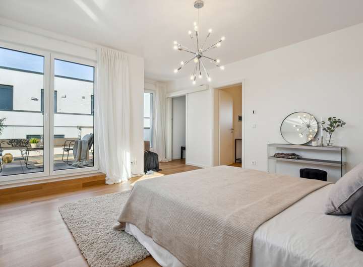 Das zweite Obergeschoss präsentiert sich als Bel-Etage – eine exklusive Ruhezone mit großzügigem Hauptschlafzimmer, luxuriösem Ankleidebereich und eigenem Bad. Von hier führt der Weg zur beeindruckenden Dachterrasse mit Süd-West-Ausrichtung – ein privilegierter Ort für entspannte Momente mit Panoramablick.