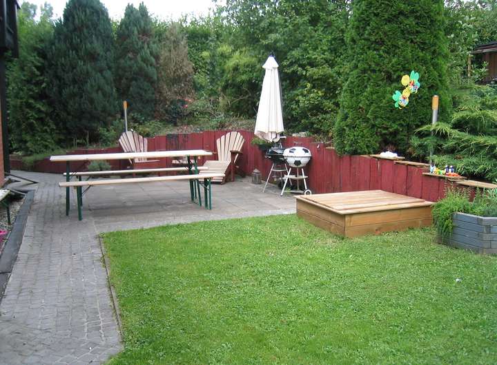 Der große Garten erstreckt sich sowohl nach Osten als auch nach Süden und präsentiert sich als idealer Ort für gemütliche Stunden mit Familie und Freunden.