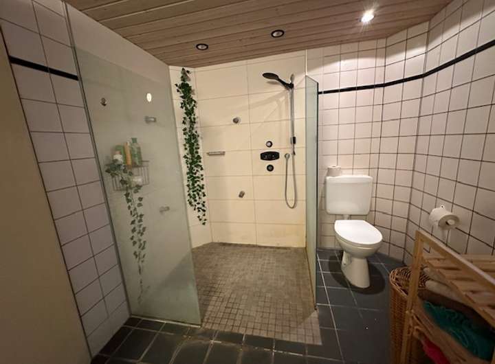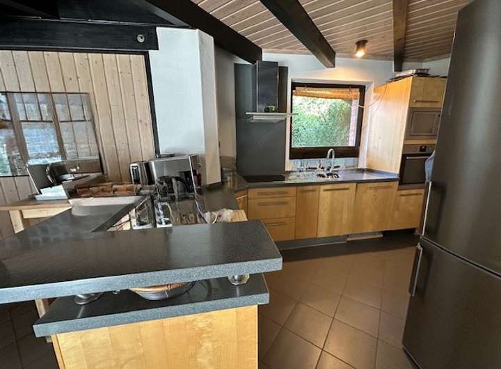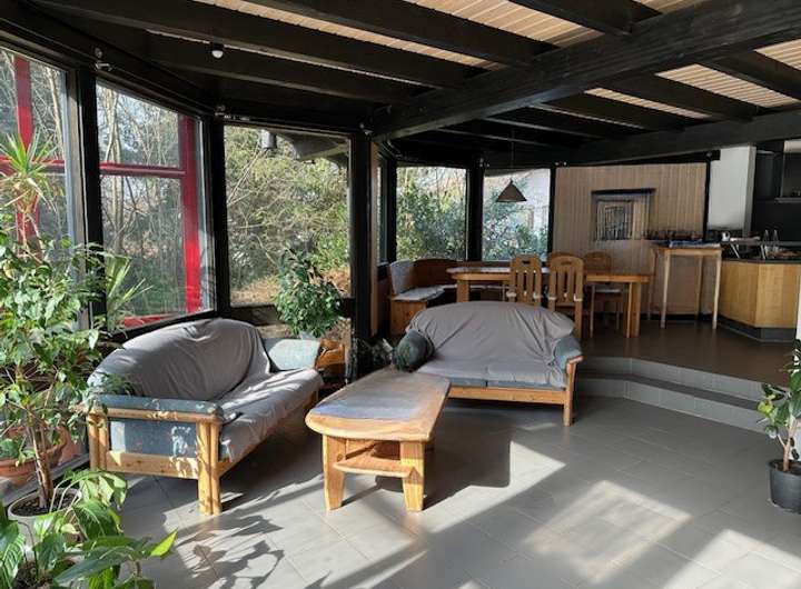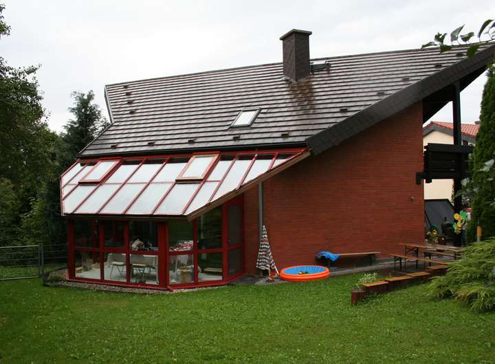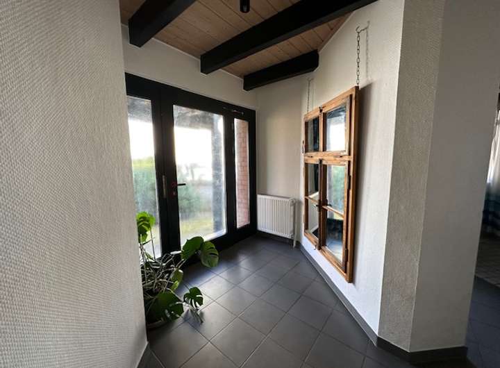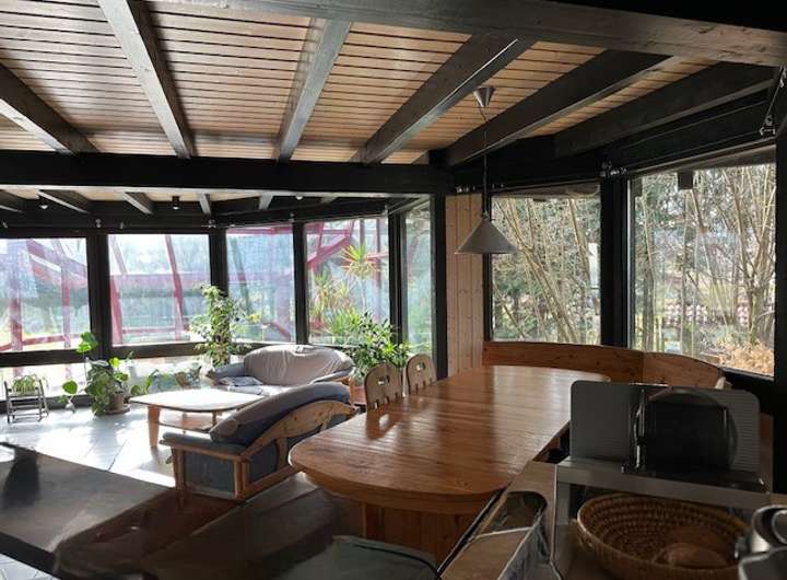 Sie betreten das Haus über einen Eingangsbereich mit Tageslicht-Duschbad und Garderobe. Von hier aus gelangt man zur Küche (Einbauküche) und zum offenen Wohn- und Essbereich mit Holzofen. Das Wohn- und Esszimmer ist großzügig und lichtdurchflutet mit Ausgang zum Wintergarten. Vom Wintergarten aus gelangt man in den großen Garten.