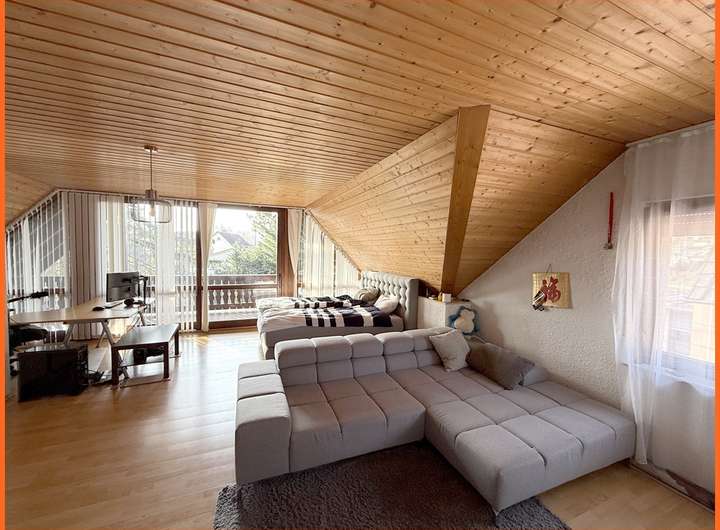 Über eine breite Treppe erreichen Sie das Obergeschoss. Das ca. 40 m² Wohnstudio mit Balkon ist vielseitig nutzbar. Z.B. als Arbeitsstudio, zweites Wohnzimmer oder Schlaf-Wellnesszimmer. Von der Diele erreichen Sie zwei Schlafzimmer ein helles, freundliches Bad mit Wanne, Dusche, Bidet und Toilette.