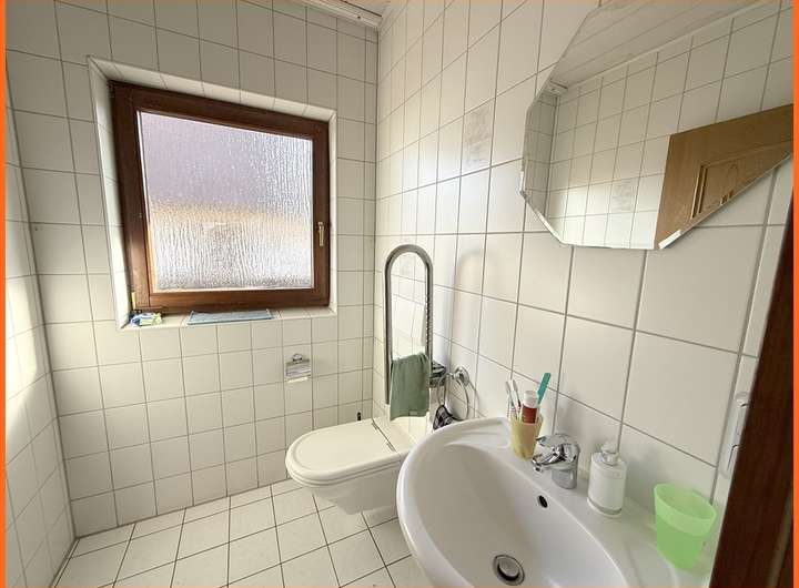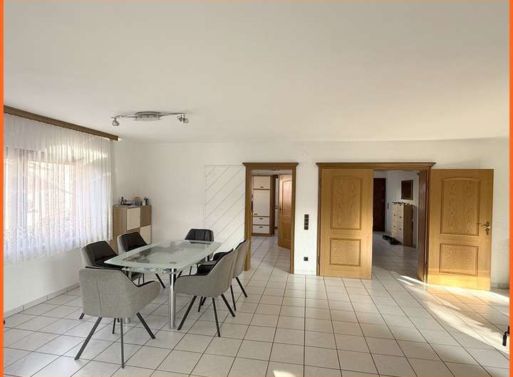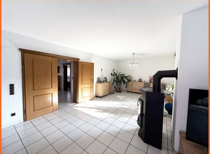 Mittelpunkt ist das etwa 60 m² große Wohn-Esszimmer mit Ausgang auf die Terrasse und in den Garten. Ein Anschluss für einen Kaminofen ist auch vorhanden. Direkt angrenzend finden Sie die große Küche mit etwa 15 m². Auf dieser Ebene erwarten Sie noch ein Arbeits- oder Gästezimmer, ein Gäste-WC und ein großzügiger Flur.