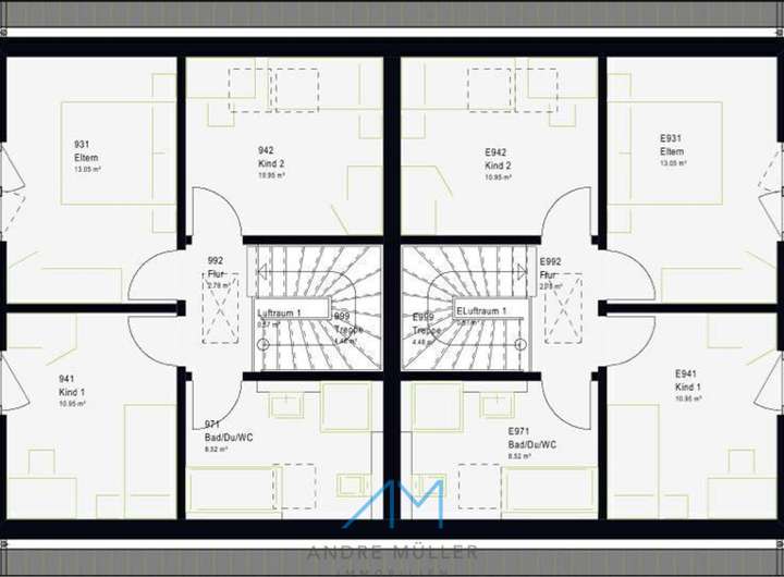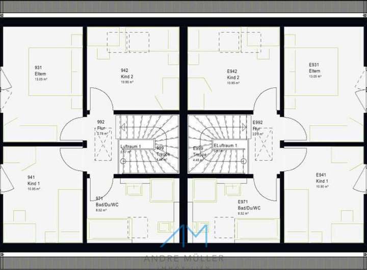 Die beiden Wohneinheiten sind spiegelbildlich angeordnet und können an die individuellen Wünsche der Baufamilien angepasst werden. Im Erdgeschoss befinden sich je ein offener Koch-, Ess- und Wohnbereich, ein Gäste-WC und ein Hauswirtschaftsraum, der von beiden Parteien genutzt werden kann. Die u-förmige Treppe führt in das obere Stockwerk, wo Platz für ein geräumiges Bad, mehrere Schlafräume oder Hobby- und Arbeitszimmer ist.