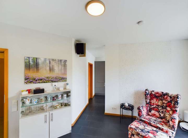 Doch fangen wir erst einmal im Haus selber an uns einen Eindruck zu verschaffen. Der Flur mit Aufgang zum Dachgeschoss besitzt einen Fahrstuhl, der zum Transport eines Rollstuhls oder Personen geeignet ist, die es beschwerlich haben, Treppen zu steigen.