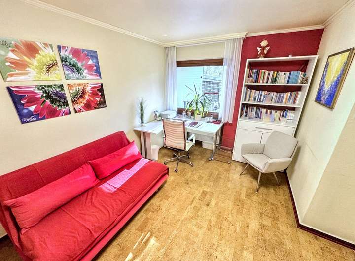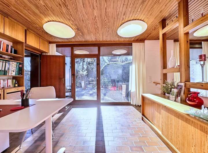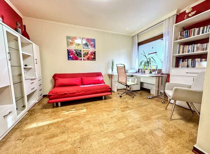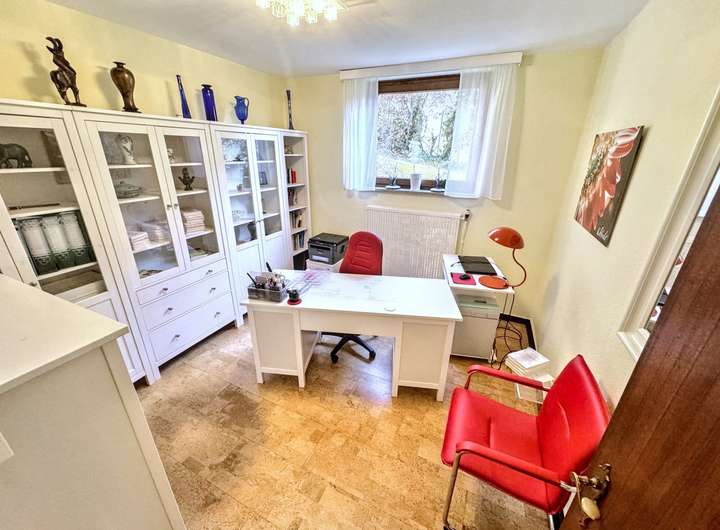 Im Untergeschoss des Hauses befindet sich der Eingangsbereich, von dem zur linken Seite ein großzügiges Zimmer abgeht. Dieser Raum, der derzeit als Hauptbüro genutzt wird, bietet direkten Zugang zu einer großzügigen, teilweise überdachten Terrasse – ideal für entspannte Stunden im Freien. Zusätzlich befinden sich in diesem Geschoss zwei weiterer Räume, ein separates WC sowie ein Duschbad. Die weiteren drei Räume mit rund 24 m² Nutzfläche dienen derzeit als Hauswirtschaftsraum, Heizungsraum und Abstellraum und ergänzen die 190 m² Wohnfläche um praktischen zusätzlichen Stauraum.