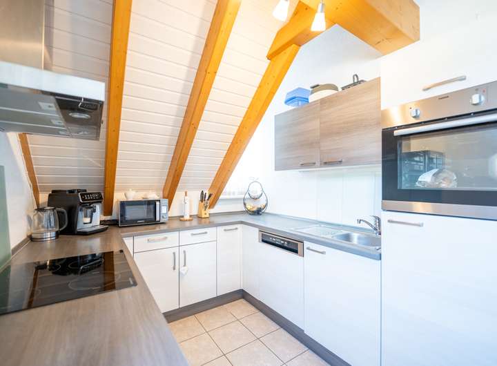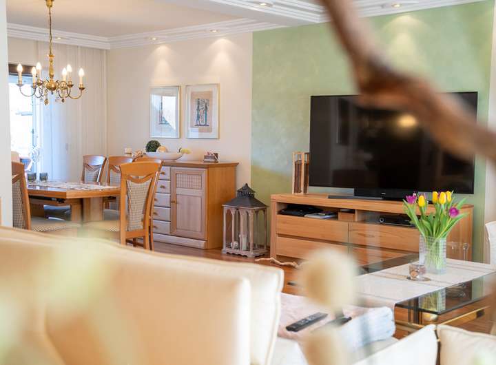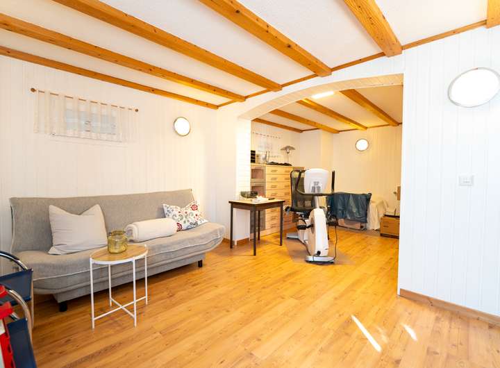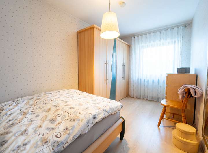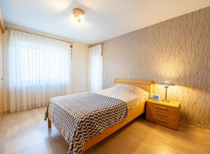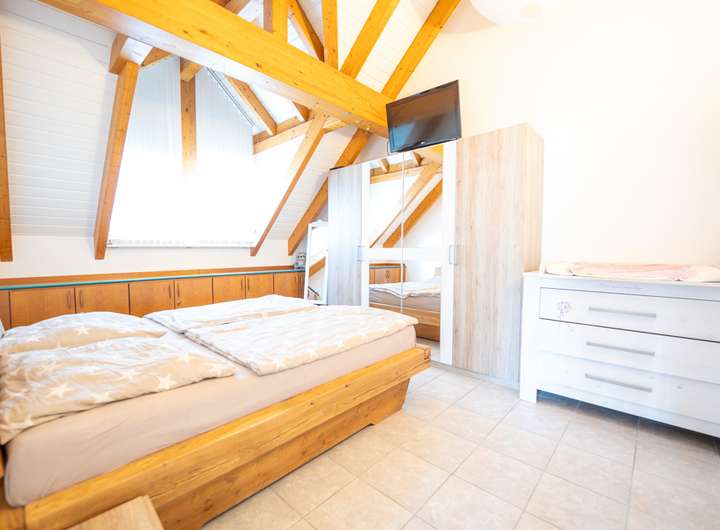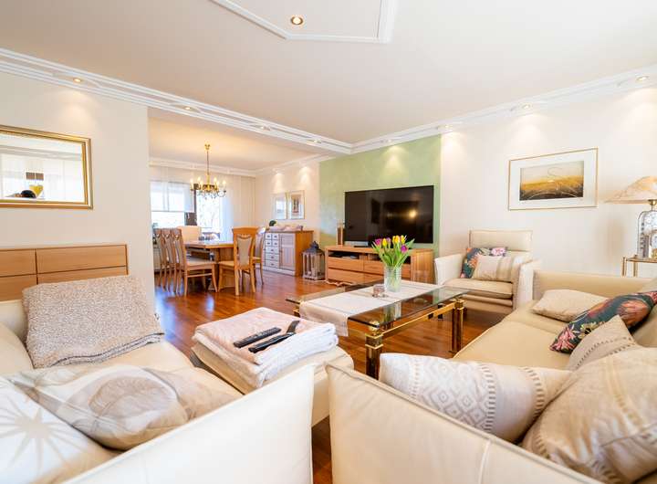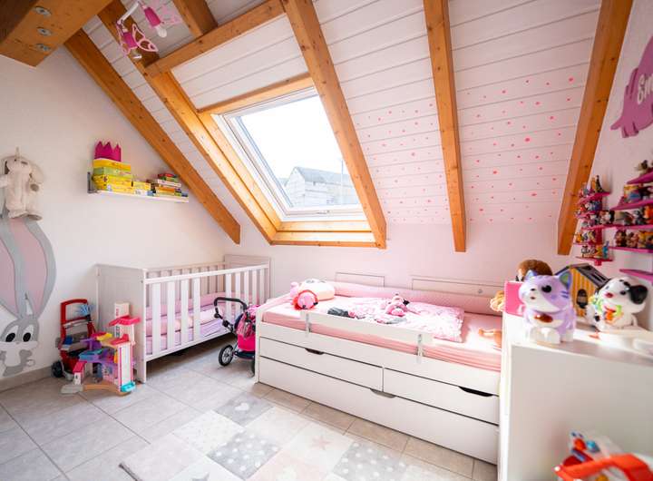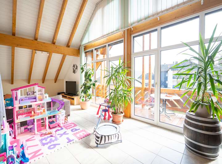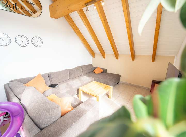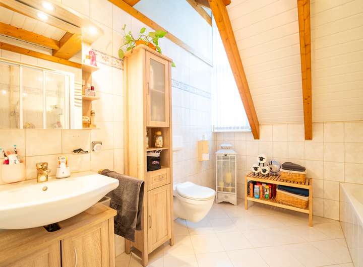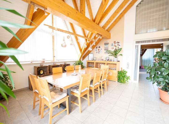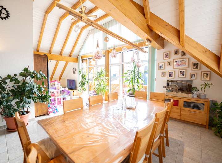 Die Einliegerwohnung im Dachgeschoss ist aktuell gut vermietet. Sie kann aber vielseitig genutzt werden, z. B. für Eltern oder Kinder im selben Haus. Auch eine Nutzung als Büro für Selbstständige wäre denkbar. Sie besticht durch großzügige Gestaltung, große Fensterflächen und eine verglaste Giebelseite, die für ein helles und freundliches Ambiente sorgt.