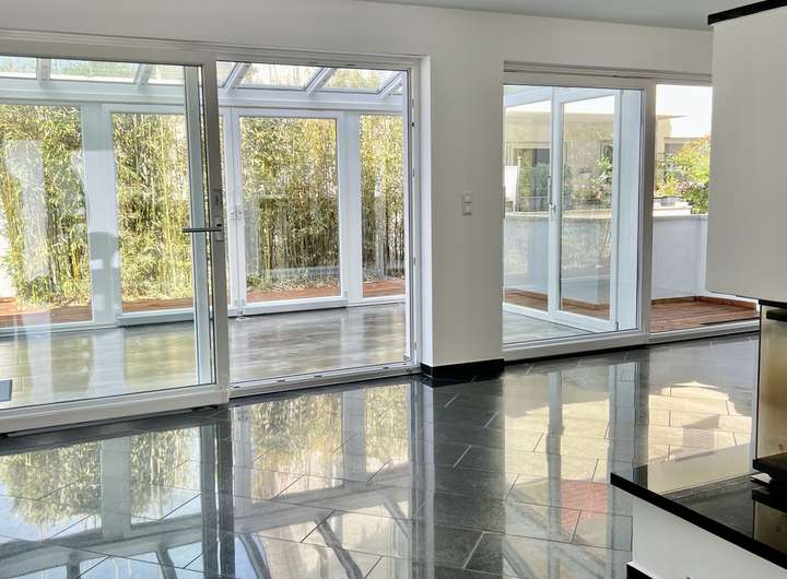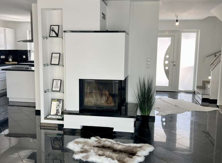 Im Erdgeschoss erwartet Sie ein offener, repräsentativer Wohn-Essbereich, der nahtlos in die moderne, offene Einbauküche übergeht. Abgerundet wird das Erdgeschoss durch eine elegante Gästetoilette und ein wahres Highlight: Der großzügige, lichtdurchflutete Wintergarten mit Außenbeschattung, der sich dank praktischer Schiebetüren vollständig öffnen lässt und einen direkten Zugang zur Terrasse bietet. Der hochwertige Kamin sorgt zudem für wohlige Wärme und gemütliche Abende im Winter.
