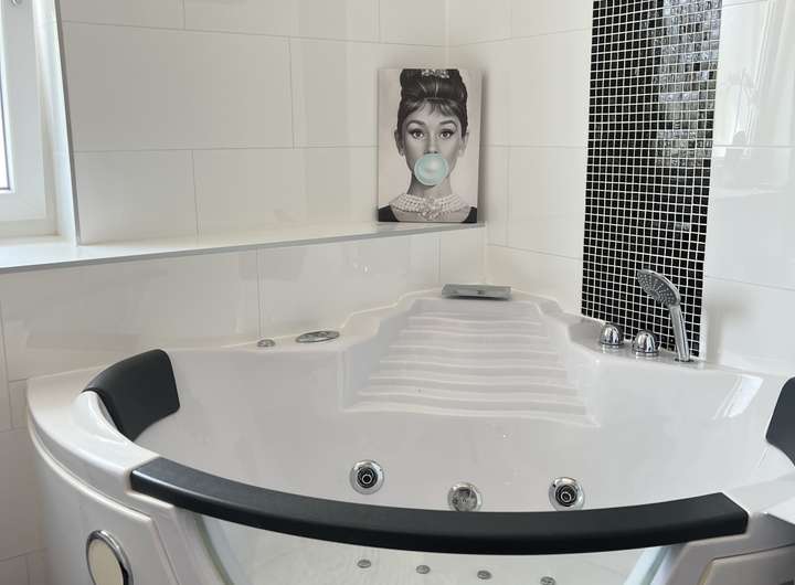 Im ersten Obergeschoss finden Sie zwei weitere Zimmer sowie einen Ankleidebereich, ein freundlicher Balkon und ein luxuriöses Tageslichtbad, das mit einer großen Dusche und einer Whirlpool-Badewanne ausgestattet ist.
