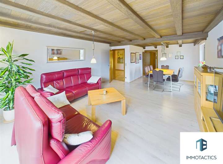 Großzügiges Wohnzimmer mit stilvollen Holzbalkendecken und gemütlichem Essbereich