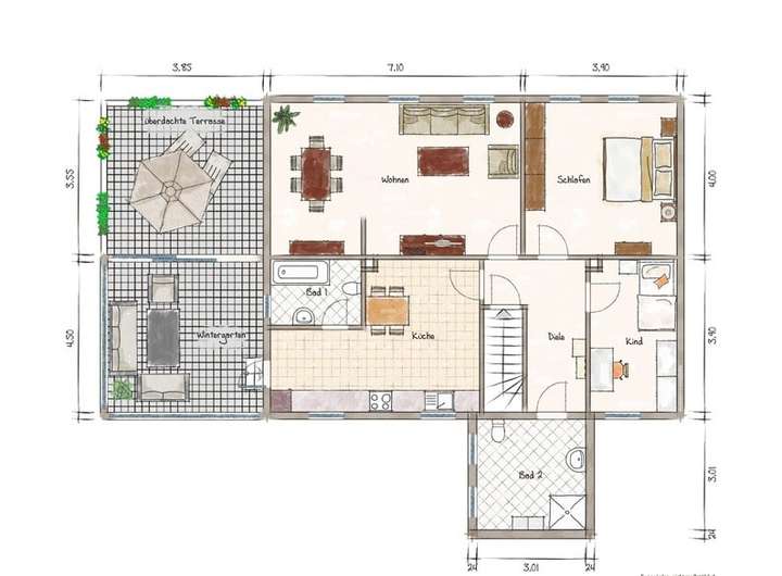3-Zimmer-Wohnung mit Küche und zwei Bädern, ca. 90 m² Wohnfläche. Diese Wohnung verfügt über einen Wintergarten mit anschließender überdachter Terrasse.