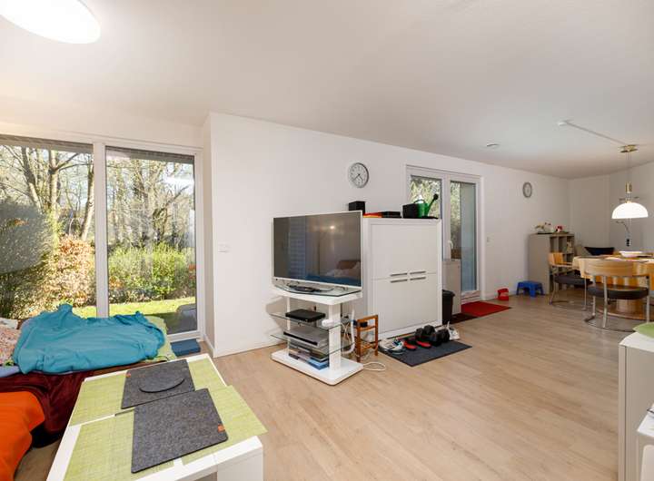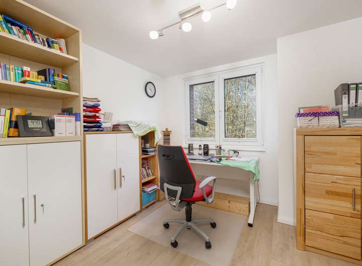Auf einer Wohnfläche von ca. 108 m² verteilen sich fünf gut geschnittene Zimmer. Besonders beeindruckend ist der ca. 33 m² große Wohnbereich mit bodentiefen Fenstern, die für eine helle und freundliche Atmosphäre sorgen. Alle Fenster im Haus sind dreifach verglast.