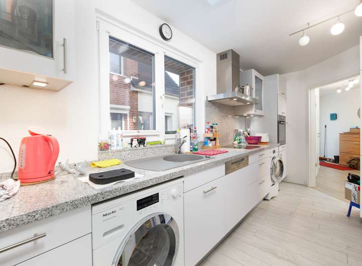 - Die Küche beinhaltet Elektrogeräte der Firma Miele und AEG. Zudem befinden sich hier auch die Waschmaschine und der Trockner