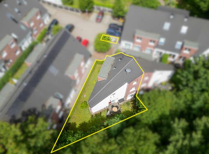 - Das Grundstück ist ideell geteilt und ca. 179m² groß. Die Terrasse befindet sich in südöstlicher Ausrichtung. Von hier aus schaut man auf den Wanderweg an der Susebek