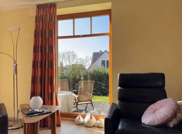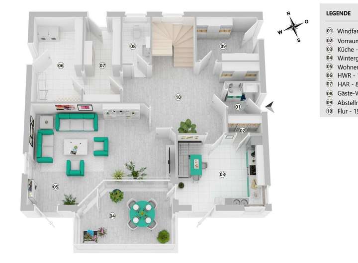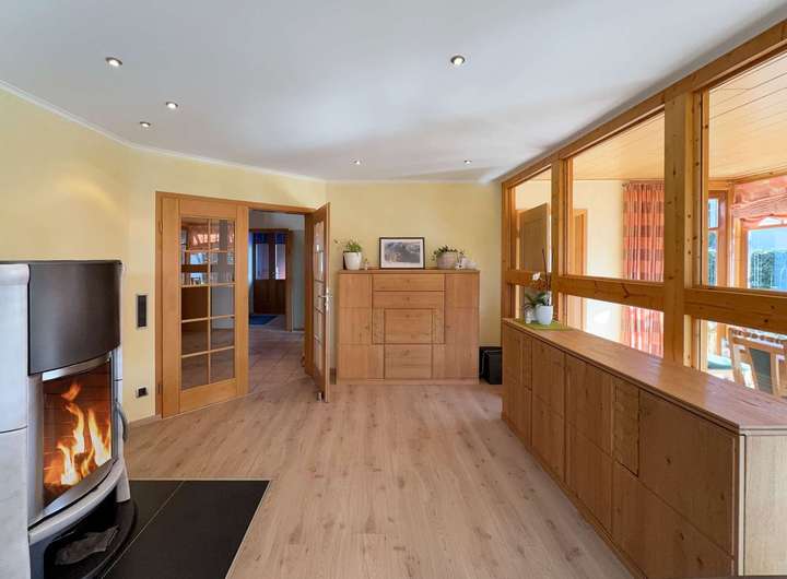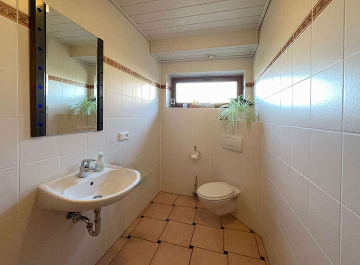 Auf der linken Seite befinden sich die helle gemütliche Küche und das große Wohnzimmer. Beide Räume sind auch über dem Wintergarten miteinander verbunden. Vom Wintergarten hat man den Blick und Zugang zum Garten. Im Sommer schützt das Weinlaub vor zu viel Sonneneinstrahlung. Das Gäste-WC, der Hausanschlussraum und der große HWR mit Zugang in den Garten ergänzen diese Etage. Im vorderen Bereich steht ein weiterer größerer Aufbewahrungsraum ohne Fenster zur Verfügung. Er befindet sich in Küchennähe und ist gut geeignet zur Aufbewahrung haltbarer Lebensmittel.