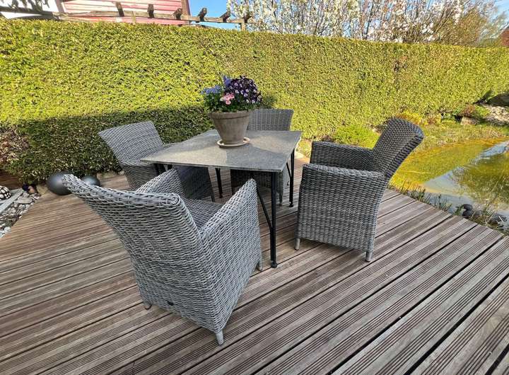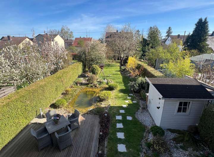 Gartenhaus, Teich, überdachte Außenterrasse und Freisitz