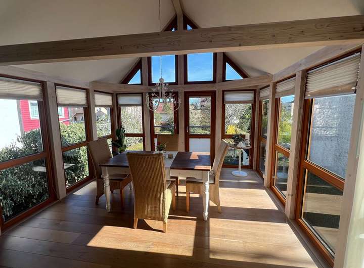Der Essbereich besticht durch einen tollen Blick in den Garten und lädt zum verweilen ein.