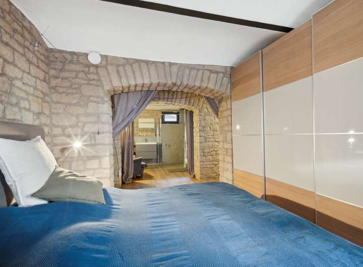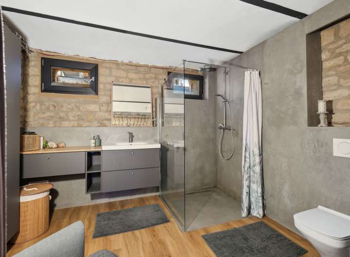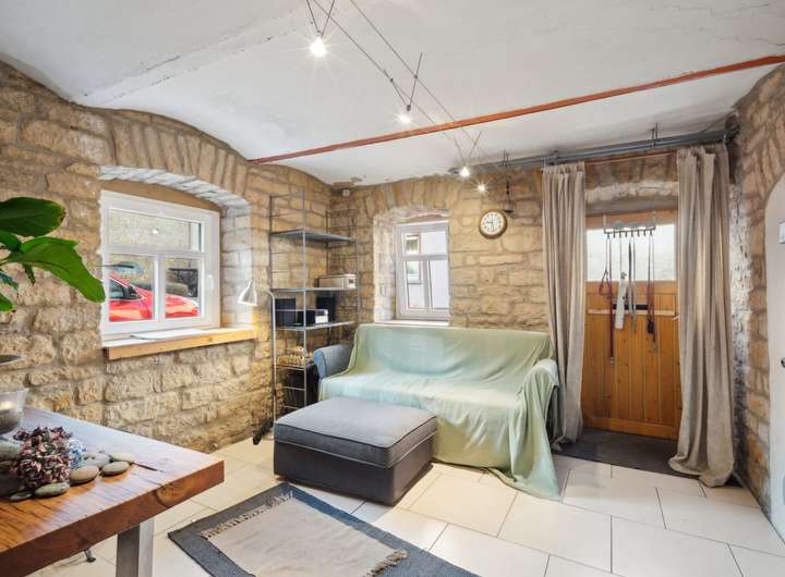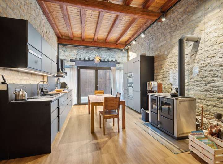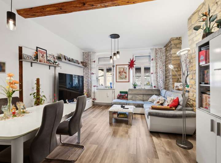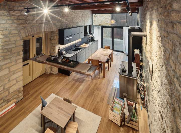 Die erste Wohneinheit erstreckt sich über das Erd- sowie das Obergeschoss und bietet eine großzügige Wohnfläche von ca. 108 m². Sie verfügt über drei Zimmer, eine Küche sowie ein Badezimmer. Die liebevolle Sanierung hat es ermöglicht, die ursprünglichen Materialien wie die beeindruckenden Sandsteinwände gekonnt mit modernen Elementen zu kombinieren. Ein besonderes Highlight ist der integrierte Holzofen in der Küche, der nicht nur für wohlige Wärme sorgt, sondern auch eine Kochgelegenheit bietet.