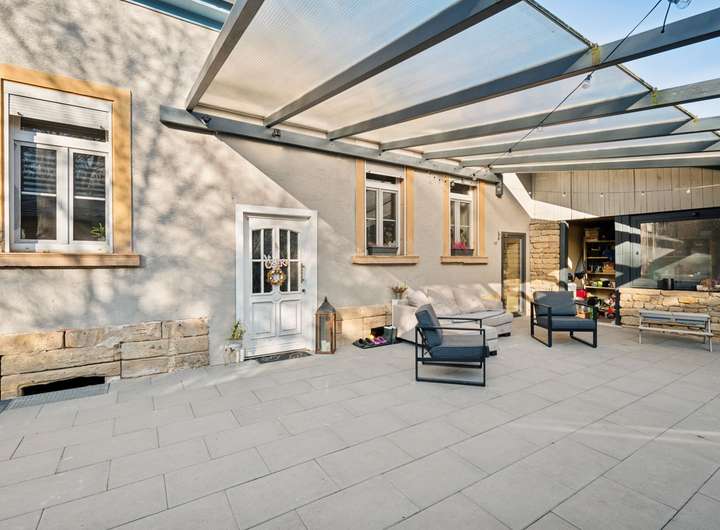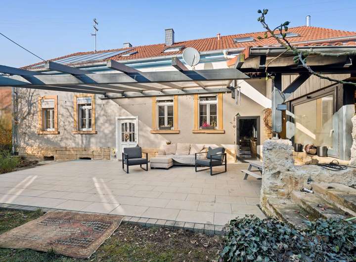Eine große, überdachte Terrasse lädt zum Entspannen ein und bietet einen nicht einsehbaren Rückzugsort im Freien. Die großzügige Gartenfläche in Hanglage stellt eine ruhige Oase dar, ideal für Erholungssuchende.