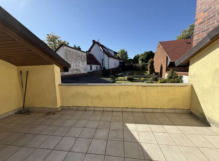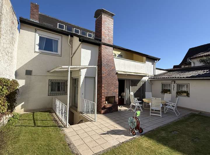 Auf der Terrasse mit ebenerdigem Zugang aus dem Wohnzimmer lässt sich wunderbar entspannen oder mit Freunden feiern, während im Hof mehrere Stellplätze für Autos zur Verfügung stehen.