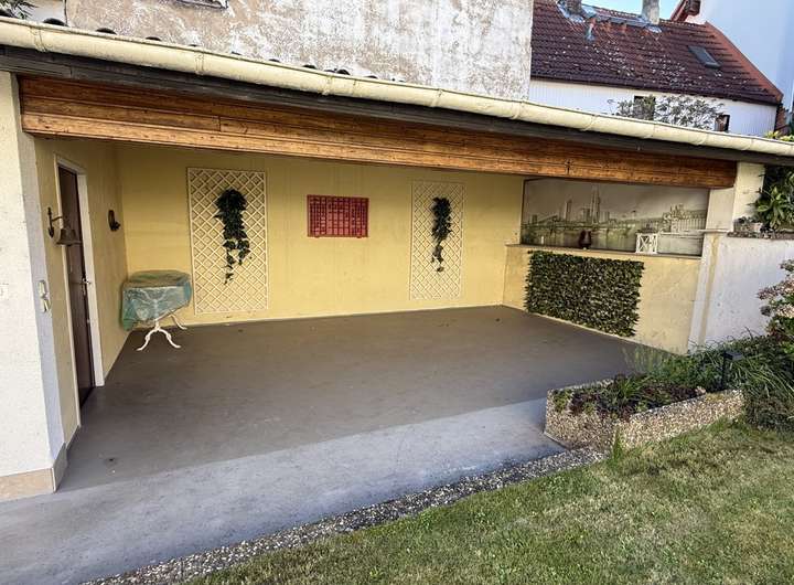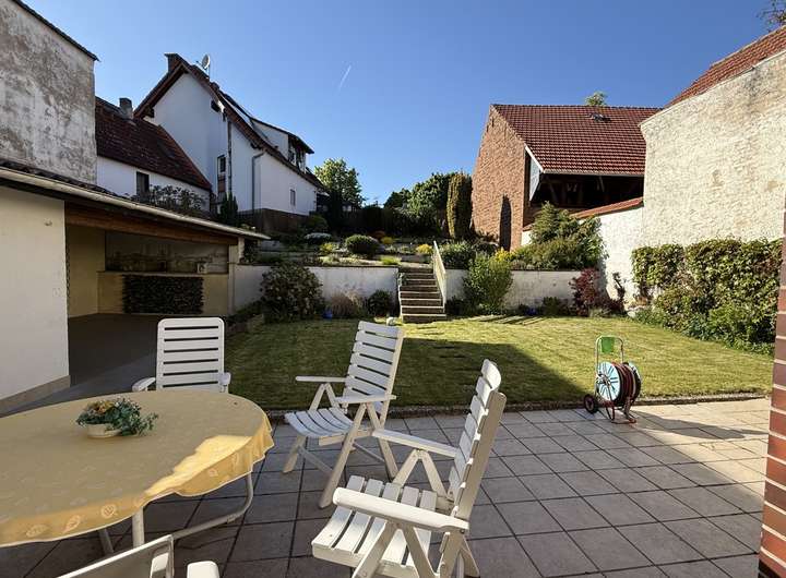 Der große Garten ist terrassenförmig angelegt und vielseitig nutzbar. Der überdachte Freisitz an der Garage lädt zu gemütlichen Stunden im Freien ein – auch wenn das Wetter mal nicht mitspielt.