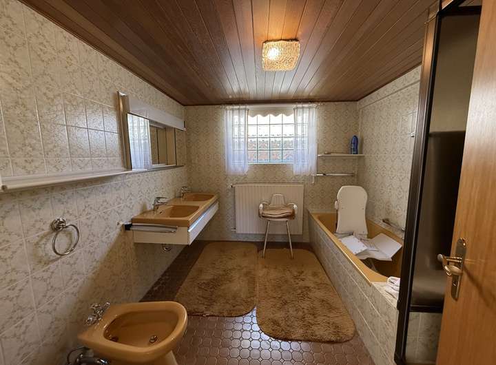 Das Badezimmer ist groß und bietet viel Potenzial für eine moderne Neugestaltung nach eigenen Ideen.